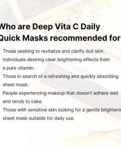 - Q. Who are Deep Vita C Daily Quick Masks recommended for?· Those seeking to revitalize and clarify dull skin. · Individuals desiring clear brightening effects from a pure vitamin.· Those in search of a refreshing and quickly absorbing sheet mask.· People experiencing makeup that doesn’t adhere well and tends tocake.· Those with sensitive skin looking for a gentle brightening sheet masksuitable for daily use.