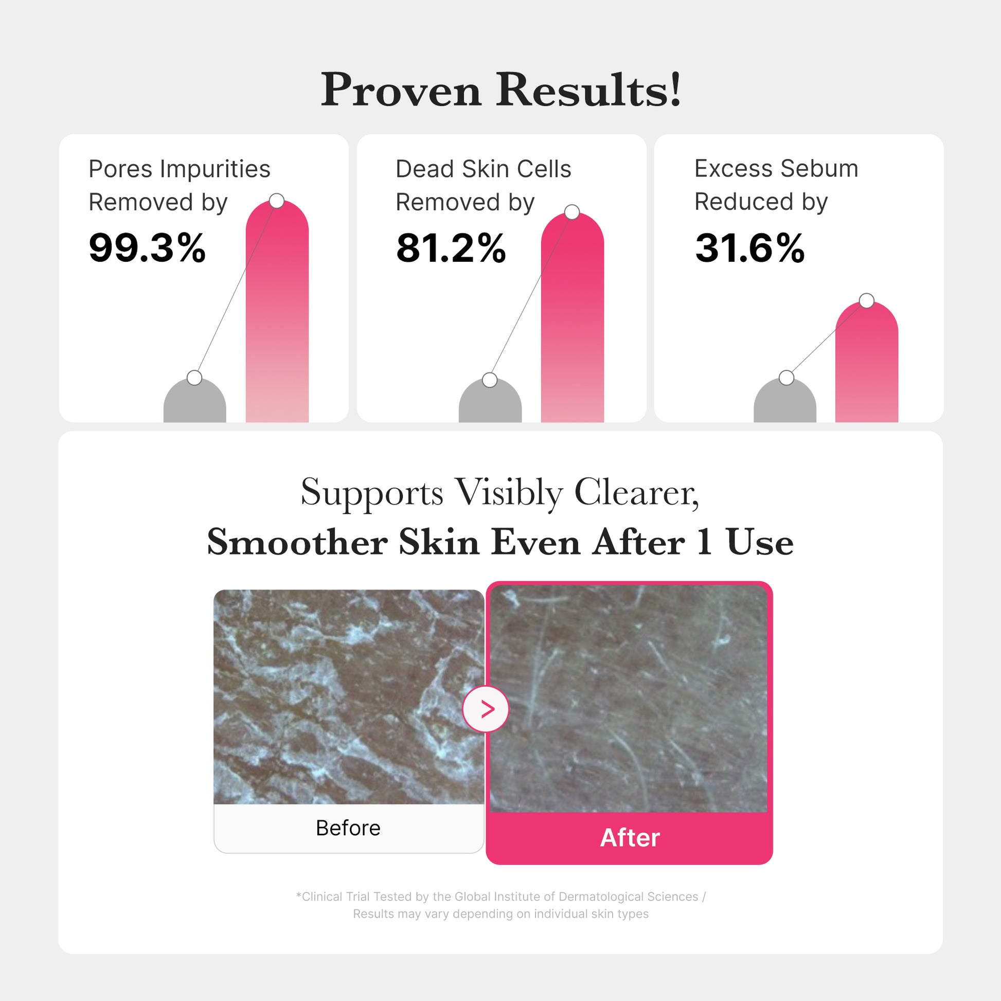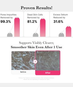 - Pores Impurities Removed by 99.3% Dead Skin Cells removed by 81.2%Excess Sebum Reduced by 31.6%