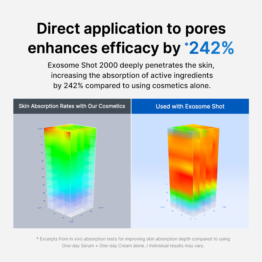 • Q. I want to focus on managing my pores. Are there any synergistic products that work well together?When used in conjunction with the Exosome Shot, the One-day Serum andOne-day Cream result in an 88% improvement in pore volume and an 85%improvement in pore area compared to using the Exosome Shot alone. For more effective pore management, we recommend using the Exosome ShotAmpoule first, followed by the One-day Serum, and finishing with theOne-day Cream. * Excerpts from in vivo absorption tests for improving skin absorptiondepth compared to using One-day Serum + One-day Cream alone. /Individual results may vary.