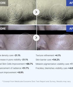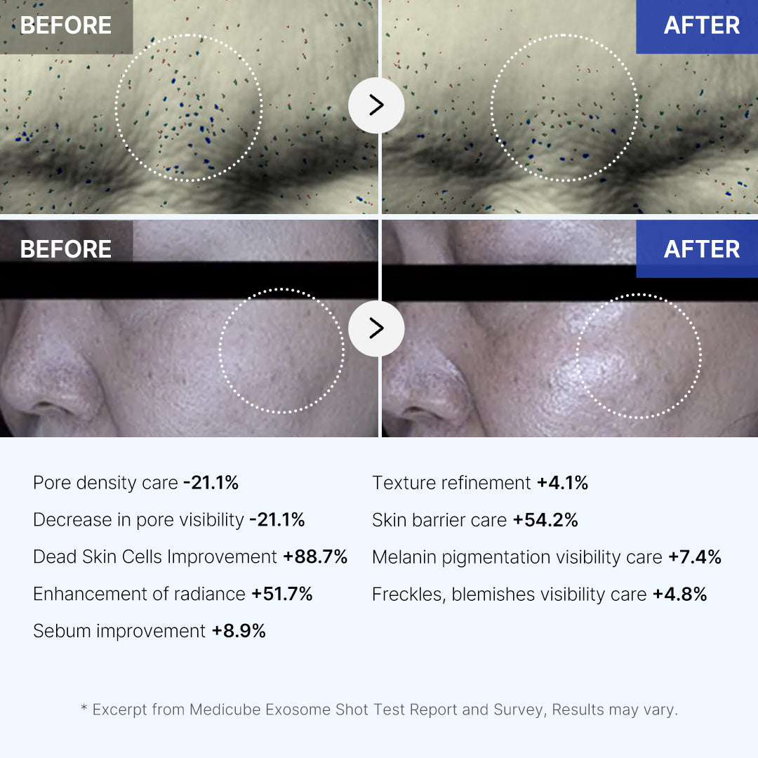 Absorption of active ingredientsAbsorption of active ingredients in cosmetics compared to standalone use+242% Pore Care Effect Pore density care -21.1% Decrease in pore visibility -21.1%Pore area -15.3%Pore volume -16.7%Other skin enhancementsDead Skin Cells improvement +88.7% Enhancement of radiance +51.7%Sebum improvement +8.9%Surface hydration enhancement +7.6%Texture refinement +4.1%Skin barrier enhancement +54.2%Line volume care +10.4%Melanin pigmentation improvement +7.4%Freckles, blemishes visibility care +4.8%* Excerpt from Medicube Exosome Shot Test Report and Survey, Results mayvary.