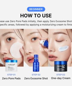 • BEGINNERIf you are not familiar with skincare products containing spicules, wedo not recommend using them with our AGE-R devices.Step 1. After cleansing, prepare your skin with Meicube’s Zero Pore Pads(or other hydrating toners). Step 2. Apply the Zero One Day Exosome Shot to the desired area (e.g.,areas with uneven texture, enlarged pores, etc.) and gently rub andpress to aid absorption.Step 3. Finish with Medicube’s Collagen Jelly Cream (or your dailywater-based moisturizer).